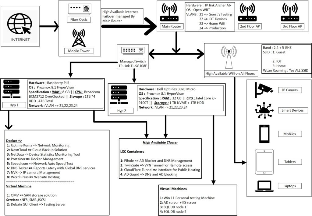 This website is built just as a fun project and in case you assume this is hosted on a Cloud platform in that case I have to disappoint you. This is completely hosted in-house and managed by me, just for an Overview look at the image below defining the entire Network diagram of my Home Network.